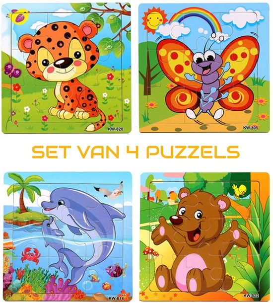 Set van 4 houten legpuzzels van verschillende dieren: een tijger, vlinder, dolfijnen en een beer. Alle vier de puzzels bevatten 9 stukjes.
