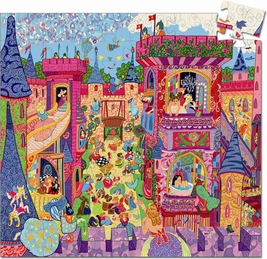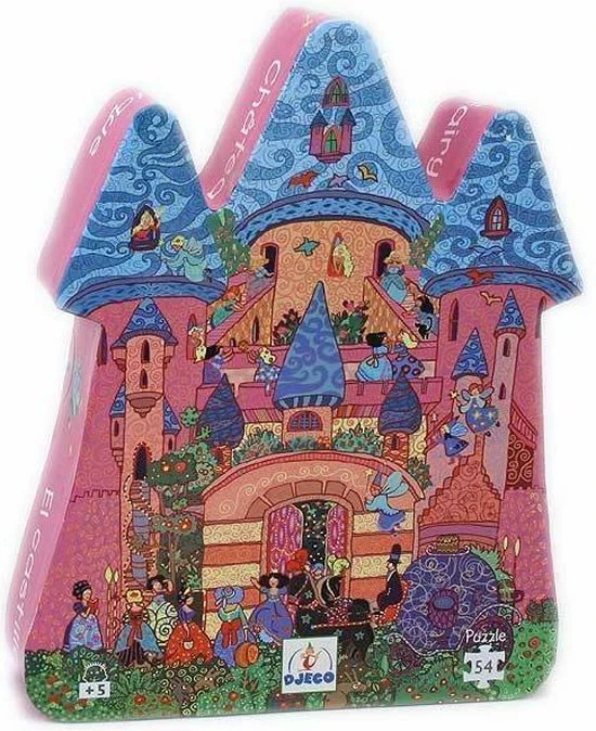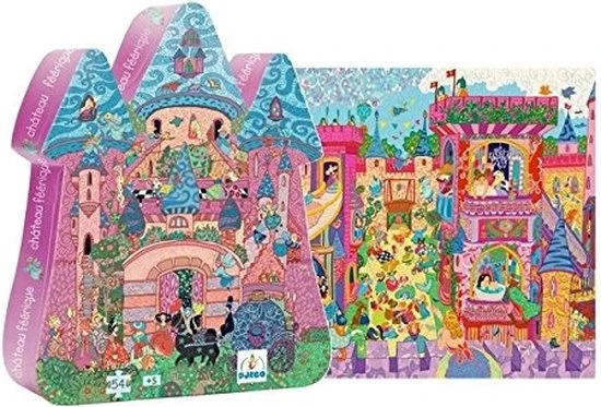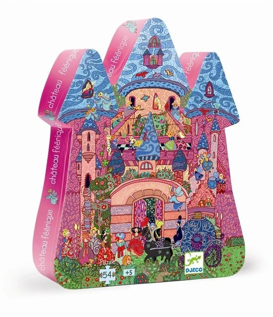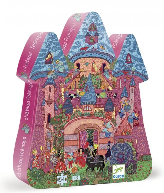 Djeco Silhouette Puzzle, Het Fee?rieke Kasteel is een charmante 54-delige puzzel die een verhaal vertelt. Hij wordt geleverd in een gevormde doos, maar de puzzel zelf is rechthoekig van vorm.