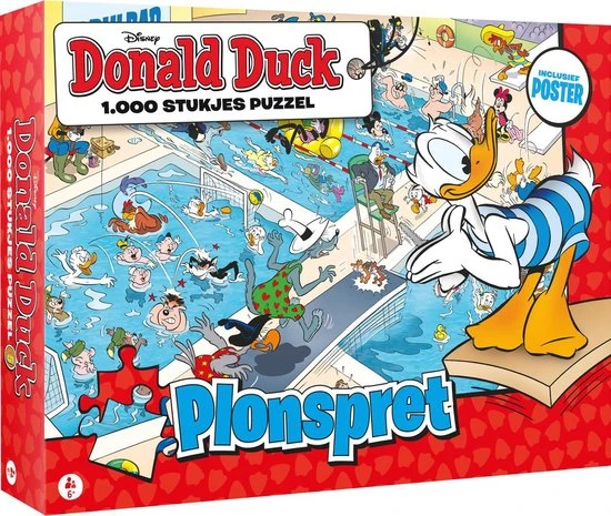 Donald Duck is het vrolijkste weekblad van Nederland! Beleef de spannende en grappige avonturen van Donald en zijn neefjes, Katrien, oom Dagobert, de Zware Jongens en andere inwoners uit Duckstad. De puzzel is opgebouwd uit 1.000 stukjes en is geschikt voor puzzelaars van 6 tot 106! In Duckstad kan zelfs een zwemwedstrijd in het water vallen. Maar met een beetje denksport kun jij deze plonsplaat weer compleet maken. Ben je klaar met alle stukjes? Dan mag je jezelf puzzelkampioen noemen!