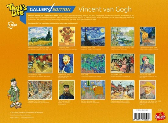De That’s Life Gallery Edition: Vincent van Gogh puzzel heeft afmetingen van 68x48cm indien compleet. De doos inclusief puzzel weegt 725 gram.