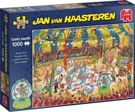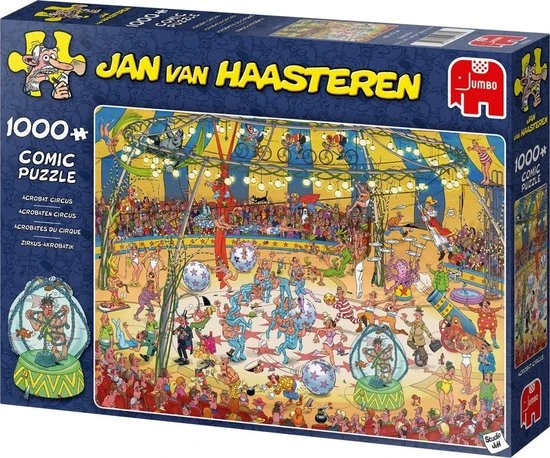 Jan van Haasteren Acrobaten Circus met 1000 Stukjes is een van de nieuwe puzzels van Jan van Haasteren. In het Acrobaten Circus verloopt niet alles even soepel. Acrobaten Circus van Jan van Haasteren is een puzzel met 1000 stukjes voor de echte Jan van Haasteren fans! Zodra je Jan van Haasteren Acrobaten Circus met 1000 Stukjes begint te puzzelen stuit je op het ene na het andere hilarische tafereel. Jan van Haasteren heeft ook deze keer weer laten zien dat humor op een prachtige manier kan worden verwerkt in een puzzel. Jan van Haasteren puzzels zijn puzzels met veel kleur en details. Jan van Haasteren tekent al decennia lang humoristische platen die je steeds weer verrassen en laten lachen. De echte fans kennen de specifieke kenmerken van Jan van Haasteren en zoeken in elke puzzel direct naar de haaienvin, Sinterklaas, de handjes, het kunstgebit en Jan?s zelfportret. Jumbo heeft tientallen Jan van Haasteren puzzels in de collectie van 54 tot maar liefst 5.000 puzzelstukjes.
