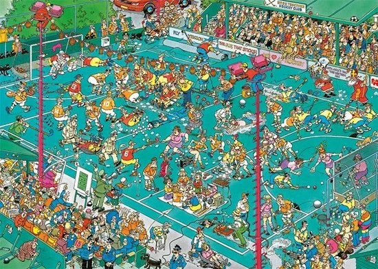 Tijdens Jan van Haasteren Hockey Kampioenschappen Puzzel 1000 Stukjes gaat echt alles mis! Niet alleen op het veld, maar ook in het publiek zijn er vele grappige details te zien. Op deze legpuzzel van Jan van Haasteren Hockey Kampioenschappen met 1000 Stukjes is het totale chaos! Tijdens het puzzelen van Jan van Haasteren Hockey Kampioenschappen Puzzel met 1000 Stukjes kom je steeds meer grappige details en taferelen tegen. Jan van Haasteren heeft ook deze keer weer laten zien dat humor op een prachtige manier kan worden verwerkt in een puzzel. Jan van Haasteren puzzels zijn puzzels met veel kleur en details. Jan van Haasteren tekent al decennia lang humoristische platen die je steeds weer verrassen en laten lachen. De echte fans kennen de specifieke kenmerken van Jan van Haasteren en zoeken in elke puzzel direct naar de haaienvin, Sinterklaas, de handjes, het kunstgebit en Jan?s zelfportret. Jumbo heeft tientallen Jan van Haasteren puzzels in de collectie van 54 tot maar liefst 5.000 puzzelstukjes.
