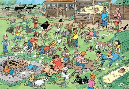 De vrienden van Jan van Haasteren gaan een dagje naar de plaatselijke kinderboerderij. Ze hebben de grootste lol bij het spelen met hun favoriete dieren, maar mogen ze wel op de dieren zitten? De boer ziet er niet zo gelukkig uit! Deze humoristische legpuzzel van 360 stukjes is geschikt voor kinderen vanaf 7 jaar.