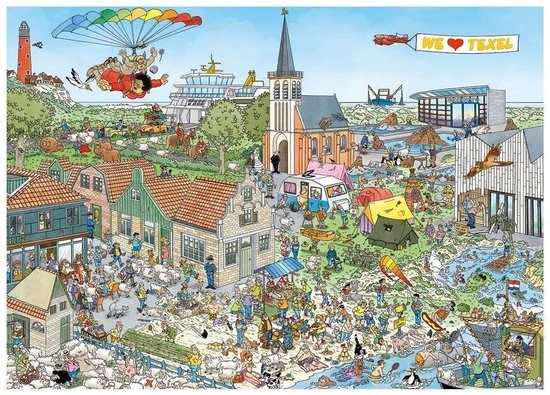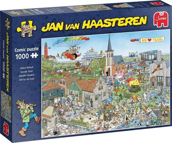 Een schitterende Jan van Haasteren puzzel van het Nederlandse eiland Texel met 1000 stukjes. Deze puzzel Rondje Texel laat vele bezienswaardigheden van Texel zien op een komische manier. Het puzzelen van deze editie is daarom ook harstikke leuk als je deze plekken herkent. Let op het is harstikke druk op Texel, dus hopelijk lukt het jou om alle figuurtjes een plekje te geven.