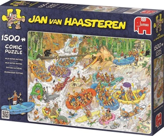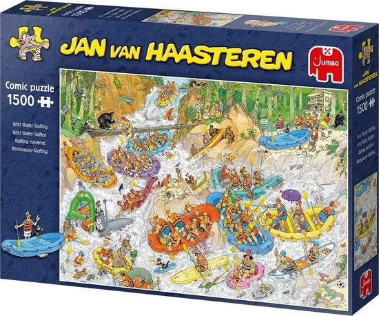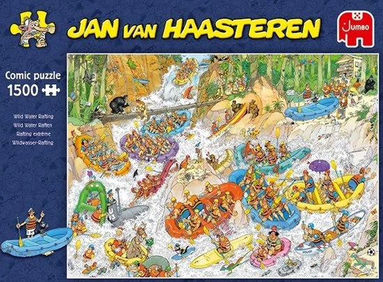 Ga je mee Wild Water Raften in de bossen? Met deze puzzel neemt Jan van Haasteren je mee in een bootje de rivier af. Wat kan er allemaal mis gaan? Een heleboel! Veel plezier met de nieuwste puzzel van Jan van Haasteren. Wild Water Raften is verkrijgbaar in 1500 en in 3000 stukjes.