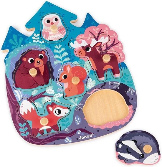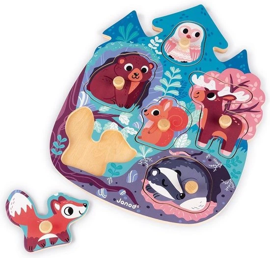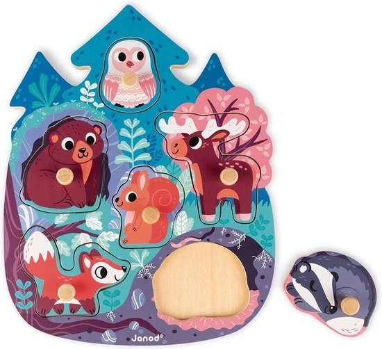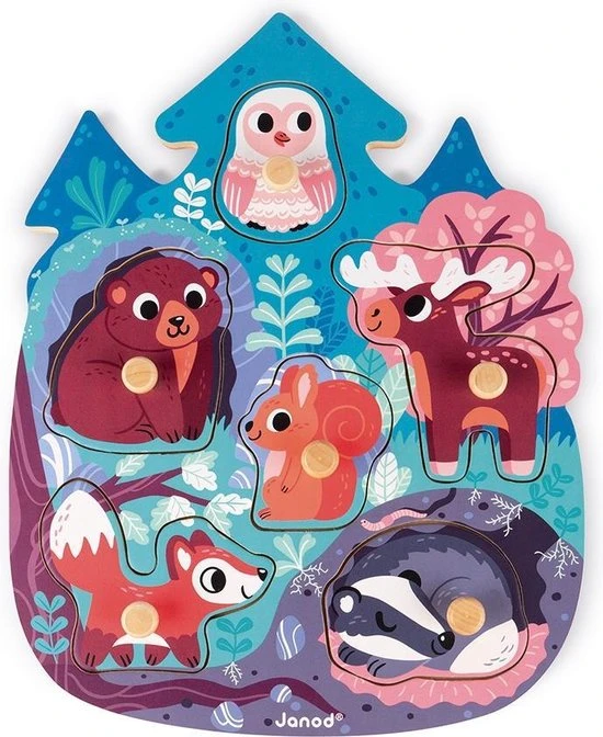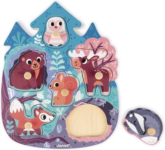Houten raampuzzel met grote knoppen waarmee kleine kinderhandjes gemakkelijk de puzzelstukken kunnen vastpakken. Deze puzzel is in bosdieren thema en heeft 6 knop puzzelstukken