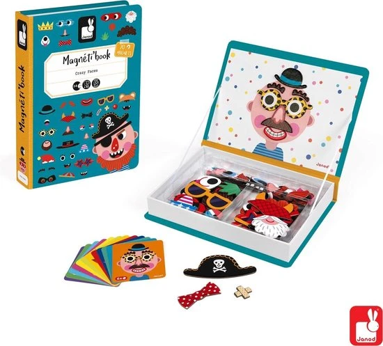 Educatief magneetspel van karton voor jongens met gezichten als thema. Bevat 70 magneten en 12 kaarten. Open het boek en maak hetzelfde gezicht als deze die op de kaart is aangegeven met behulp van de magneten. Het kind kan tevens andere gekke gezichten maken door andere magneten te gebruiken dan deze die op de kaart zijn aangegeven.