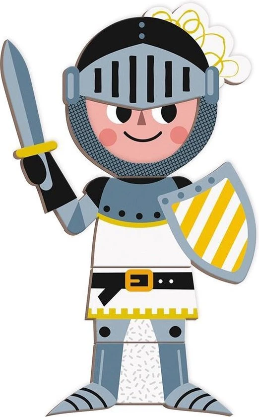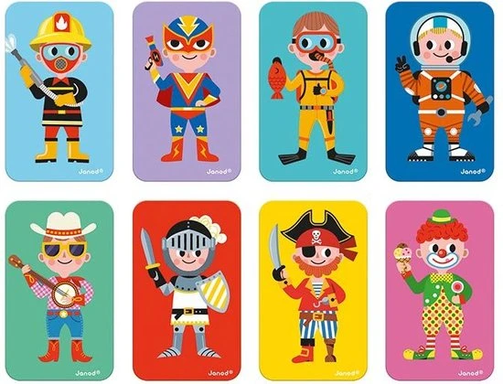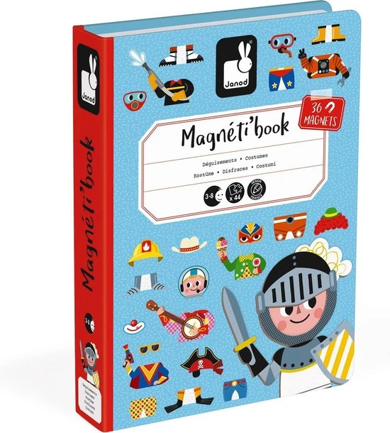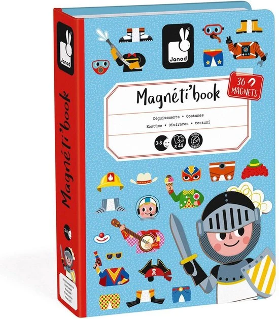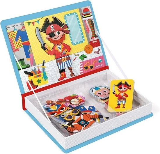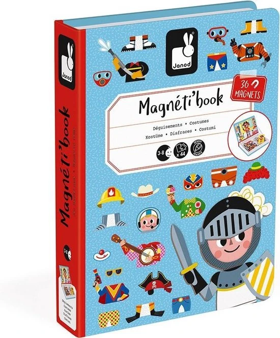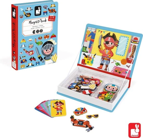 Educatief magneetspel van karton met vermommingen voor jongens als thema. Bevat 36 magneten en 8 kaarten. Open het boek en maak dezelfde vermomming als deze die op de kaart is aangegeven met behulp van de magneten.