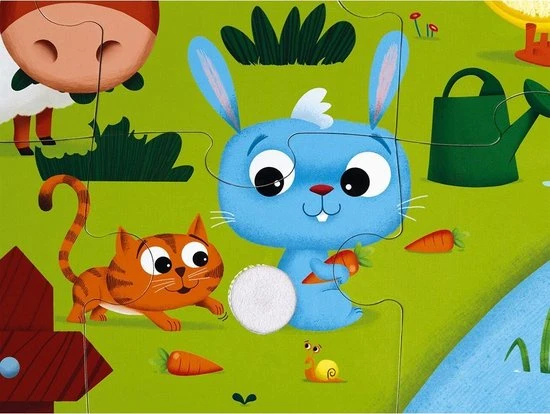 - 20 puzzelstukken: koe, schaap, haan, varken,… waarvan 7 voelbare stukken