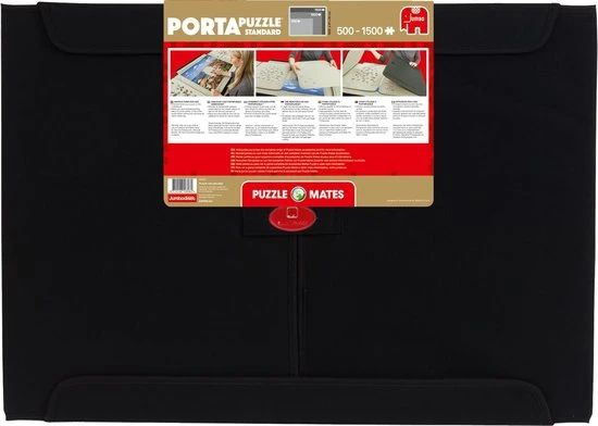 Met deze Jumbo Portapuzzle Standaard wordt het zeer eenvoudig om puzzels op te bergen en te vervoeren. Tijdens het puzzelen leg je de puzzel in het middendeel van de Portapuzzle en op de zijpanelen en losse panelen kan je de stukjes sorteren. Als je klaar bent met puzzelen plaats je de losse panelen over de puzzel, haal je de stukjes uit het zijpaneel en klap je vervolgens de zijpanelen over het middendeel heen. Sluit het middelste klittenband en daarna het klittenband boven- en onderaan het bord. Zo kun je verder puzzelen wanneer het jou uitkomt! De puzzelaccessoire is geschikt voor het opbergen van puzzels van 500 tot 1500 stukjes en de afmetingen zijn 94 x 68 cm. De maximale afmeting van een puzzel die op deze mat past is 90×60 cm.