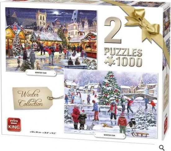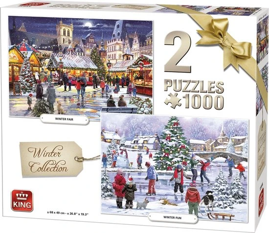 Kom in de winterse sferen met deze Wintercollectie legpuzzels van King. Er is een wintermarkt en schaatsbaan te zien. Beide puzzels bevatten ieder 1000 stukjes, genoeg voor uren puzzelplezier! De Wintercollectie legpuzzels van King zijn gemaakt van karton en hebben beide een afmeting van 68 x 49 cm.
