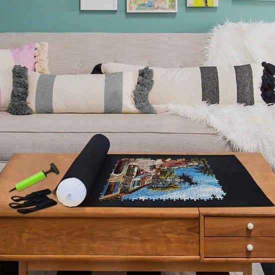 Wanneer je klaar bent met puzzelen, blaas je de witte buis op met het bijgeleverde handpompje. Rol de mat voorzichtig om de buis heen en bevestig de zwarte bandjes om de buis, zodat je puzzel intact blijft. Daarna pak je de opbergtas en stop je de rol hierin. Zo kun je eenvoudig de puzzel opbergen en neem je weinig ruimte in beslag!