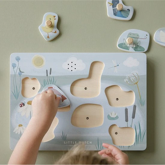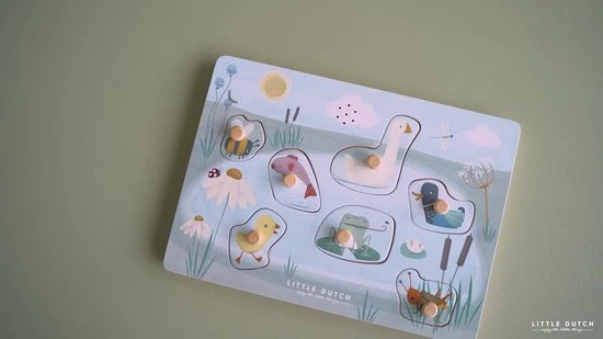 Maak kennis met Little Goose en zijn vriendjes. Herken hun vormen en unieke geluiden met deze leuke puzzel. Als je het diertje terugplaatst op het juiste plekje hoor je het plonsen, kwaken of zoemen. Ontworpen voor je kind om de levende wezentjes rond de vijver op het platteland te leren kennen. Deze puzzel met 7 diertjes en geluiden bevordert de oog- hand co?rdinatie en stimuleert de woordenschat van je kindje.