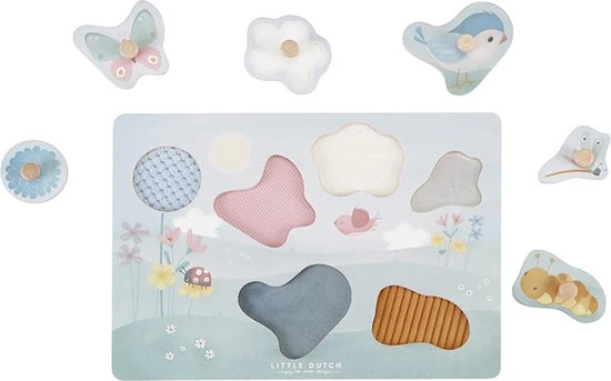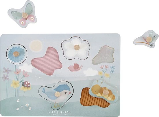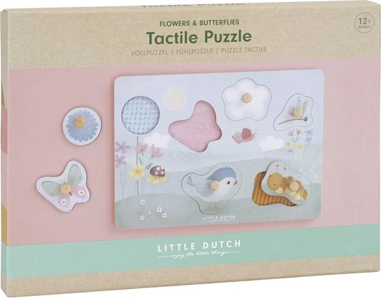 Wat zit er achter het vogeltje? Raak en voel de verschillende texturen onder elk stukje van de houten voelpuzzel. Is het zacht of geribbeld? Welke kleur zie je? Herkende jij de vormen van de rups en de vlinder? Deze voelpuzzel is geweldig educatief speelgoed voor kinderen, omdat het de fijne motoriek verbetert en de nieuwsgierigheid stimuleert door middel van zintuiglijk spel. Dankzij de houten pinnen kunnen kinderen de puzzelstukjes gemakkelijk hanteren en op de juiste plek leggen. Vanaf 12 maanden.