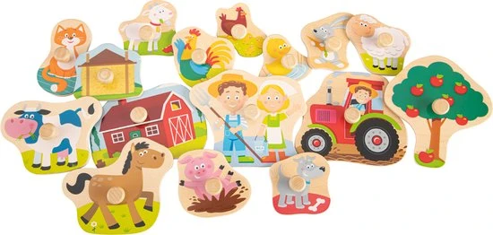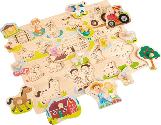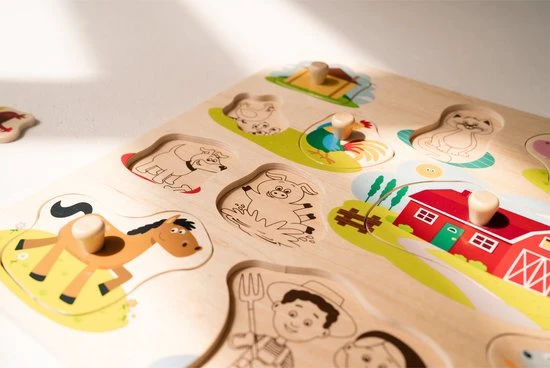 Ontdek de boerderij en ontmoet de dieren die daar leven met deze knoppuzzel van New Classic Toys. De afbeeldingen onder de puzzelstukken maken het puzzelen eenvoudig en leuk. Door de grote knoppen kunnen de stukken gemakkelijk worden opgepakt en weer teruggeplaatst. Stimuleert het herkennen van vormen, kleuren en de fijne motoriek. Deze puzzel bestaat uit een puzzelbord met zestien puzzelstukken. Deze puzzel is gemaakt van FSC? 100%-gecertificeerd hout.