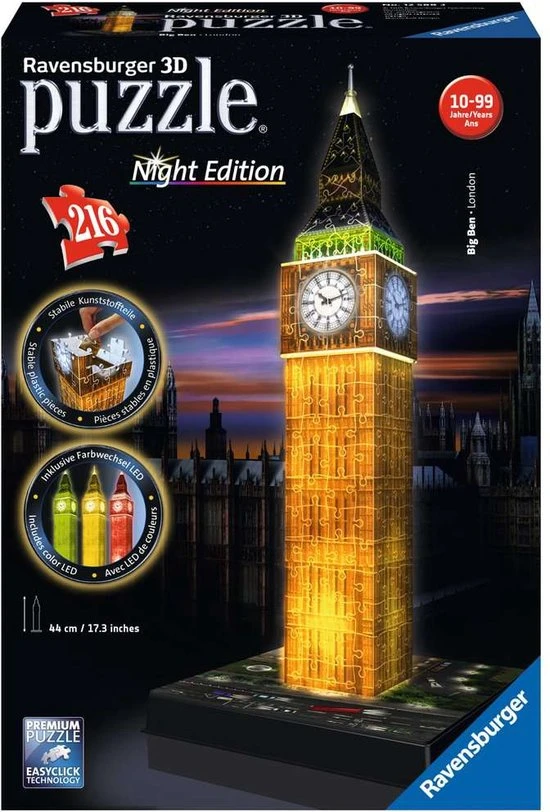 Uniek drie dimensionaal puzzelplezier, dat zijn de 3D gebouwen puzzels van Ravensburger! Puzzel prachtige 3D bouwwerken in elkaar en geef ze een mooi plaatsje op o. a. je wandplank of op het dressoir! De stevige plastic stukjes passen precies in elkaar. Zo bouw je vanuit gebogen, platte en opvouwbare stukjes een uniek model van de Big Ben, zonder lijm te gebruiken!