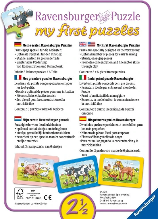 Puzzelplezier voor de allerkleinsten, met de afbeeldingen van goede vrienden: -optimaal aantal stukjes om te beginnen ? Stevige, makkelijk hanteerbare stukken ?bevordert op een speelse manier concentratie en fijne motoriek