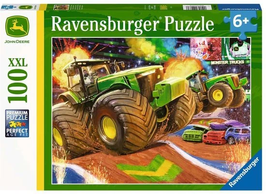 Ontsnap uit de realiteit en stap in de wereld van Ravensburger puzzels. Tijdens het puzzelen ontdekken kinderen hun grootse vaardigheden. XXL- puzzels voor XXL- puzzelplezier. De XXL-grote puzzelstukken zijn eenvoudiger te leggen. Het resultaat is een kunstwerk op posterformaat dat in geen enkele kinderkamer misstaat. Dankzij de met de hand gemaakte stansmessen is de vormvariatie van de stukjes oneindig. Kinderen vanaf 6 jaar zullen genieten van de John Deere big wheels puzzel met 100 stukjes.