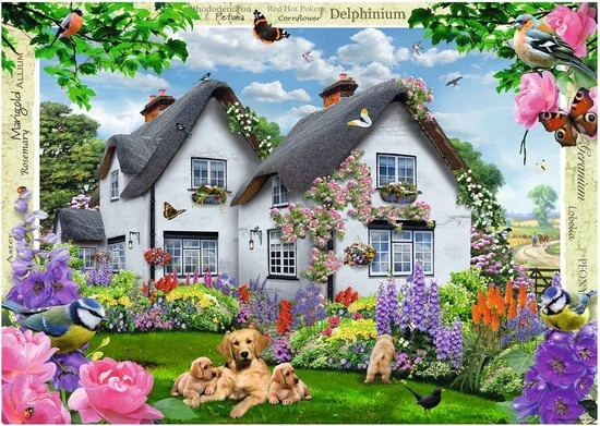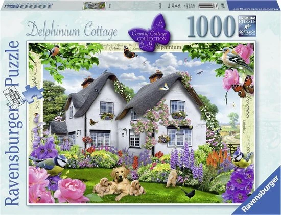 Ontsnap uit de realiteit en stap in de wereld van Ravensburger-puzzels. Ravensburger puzzel van 1000 stukjes is geschikt voor zowel beginnende als ervaren puzzelaars. En omdat onze geliefde puzzels een standaard formaat hebben, kun je het resultaat inlijsten en ophangen. Dankzij de met de hand gemaakte stansmessen is de vormvariatie van de stukjes oneindig. Jong en oud zullen genieten van deze Delphinium Cottage puzzel met 1000 stukjes.
