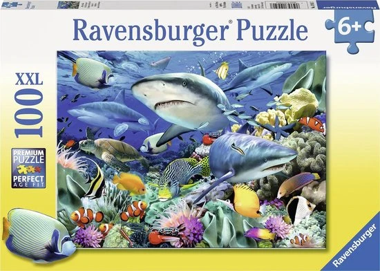 Ontsnap uit de realiteit en stap in de wereld van Ravensburger puzzels. Tijdens het puzzelen ontdekken kinderen hun grootse vaardigheden. XXL- puzzels voor XXL- puzzelplezier. De XXL-grote puzzelstukken zijn eenvoudiger te leggen. Het resultaat is een kunstwerk op posterformaat dat in geen enkele kinderkamer misstaat. Dankzij de met de hand gemaakte stansmessen is de vormvariatie van de stukjes oneindig. Kinderen vanaf 6 jaar zullen genieten van de Haaien rif puzzel met 100 stukjes met als thema dieren.