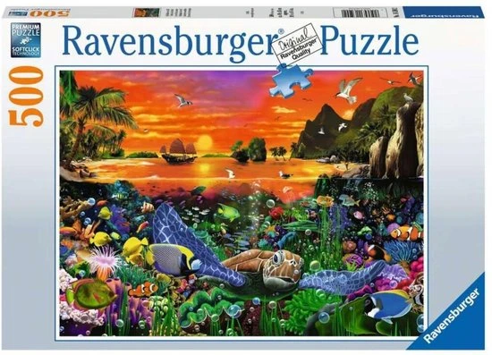 Ontsnap uit de realiteit en stap in de wereld van Ravensburger-puzzels. Deze Ravensburger puzzel van 500 stukjes is de perfecte eerste stap naar de wereld van de grote puzzels. Ideaal ook voor puzzelaars die alleen op zoek zijn naar een puzzel voor tussendoor. Dankzij de met de hand gemaakte stansmessen is de vormvariatie van de stukjes oneindig. Jong en oud zullen genieten van deze Schildpadden in het rif puzzel met 500 stukjes.