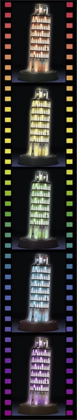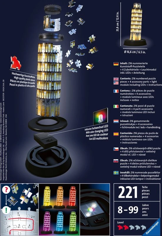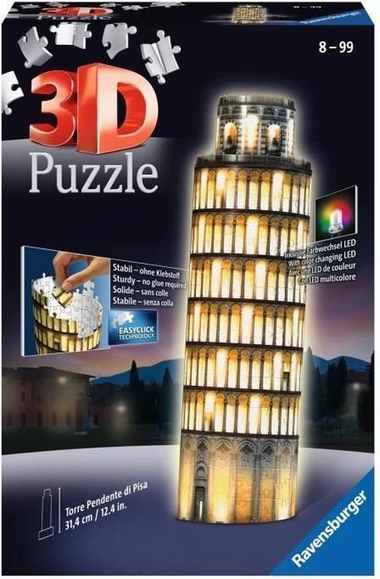 De meeste bezoekers bezichtigen de scheve toren van Pisa overdag, maar bij schemering is hij pas echt schitterend: sfeervol verlicht, wordt het ca. 55 m hoge bouwwerk in de prachtige ambiance van de Piazza dei Miracoli na het invallen van de duisternis een romantische highlight. Uniek drie dimensionaal puzzelplezier, dat zijn de 3D puzzels van Ravensburger!