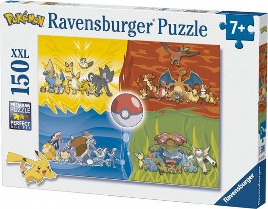 Ontsnap uit de realiteit en stap in de wereld van Ravensburger puzzels. Tijdens het puzzelen ontdekken kinderen hun grootse vaardigheden. XXL- puzzels voor XXL- puzzelplezier. De XXL-grote puzzelstukken zijn eenvoudiger te leggen. Het resultaat is een kunstwerk op posterformaat dat in geen enkele kinderkamer misstaat. Dankzij de met de hand gemaakte stansmessen is de vormvariatie van de stukjes oneindig. Kinderen vanaf 7 jaar zullen genieten van de Pok?mon Ravensburger puzzel met 150 stukjes met als thema Pok?mon.