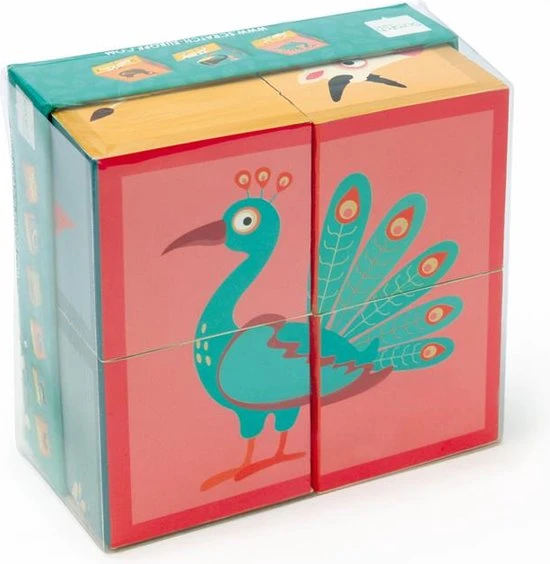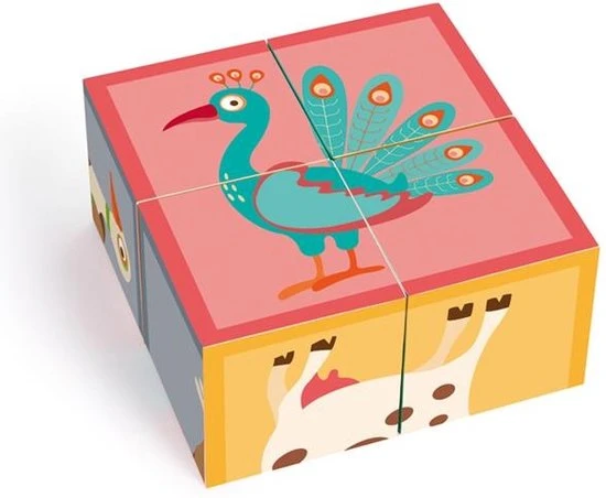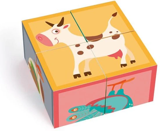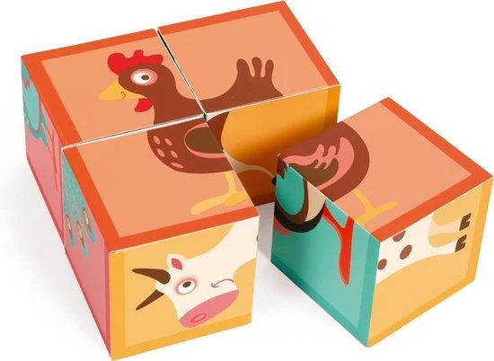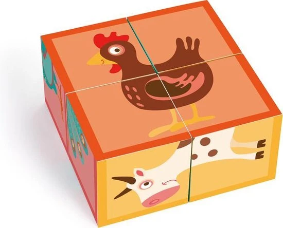 Een houten blokpuzzel van het merk Scratch. Aan elke zijde vind je verschillende boerderijdieren.