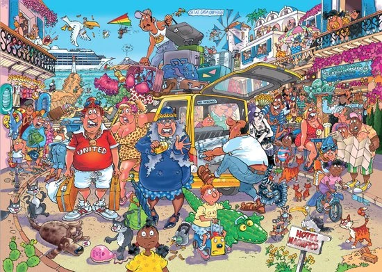 De hele familie is net gearriveerd om een vakantie vol zon, zee en sangria te vieren, maar hun schitterende hotel ziet er toch net wat anders uit dan in de fraaie brochure. Oma laat van schrik bijna haar zonnebrandcr?me uit haar handen vallen, en dat komt niet door de dure drankjes! Waardoor valt de vakantie van oma in het water, nog voordat ie goed en wel is begonnen? Dat is het beeld dat je puzzelt.